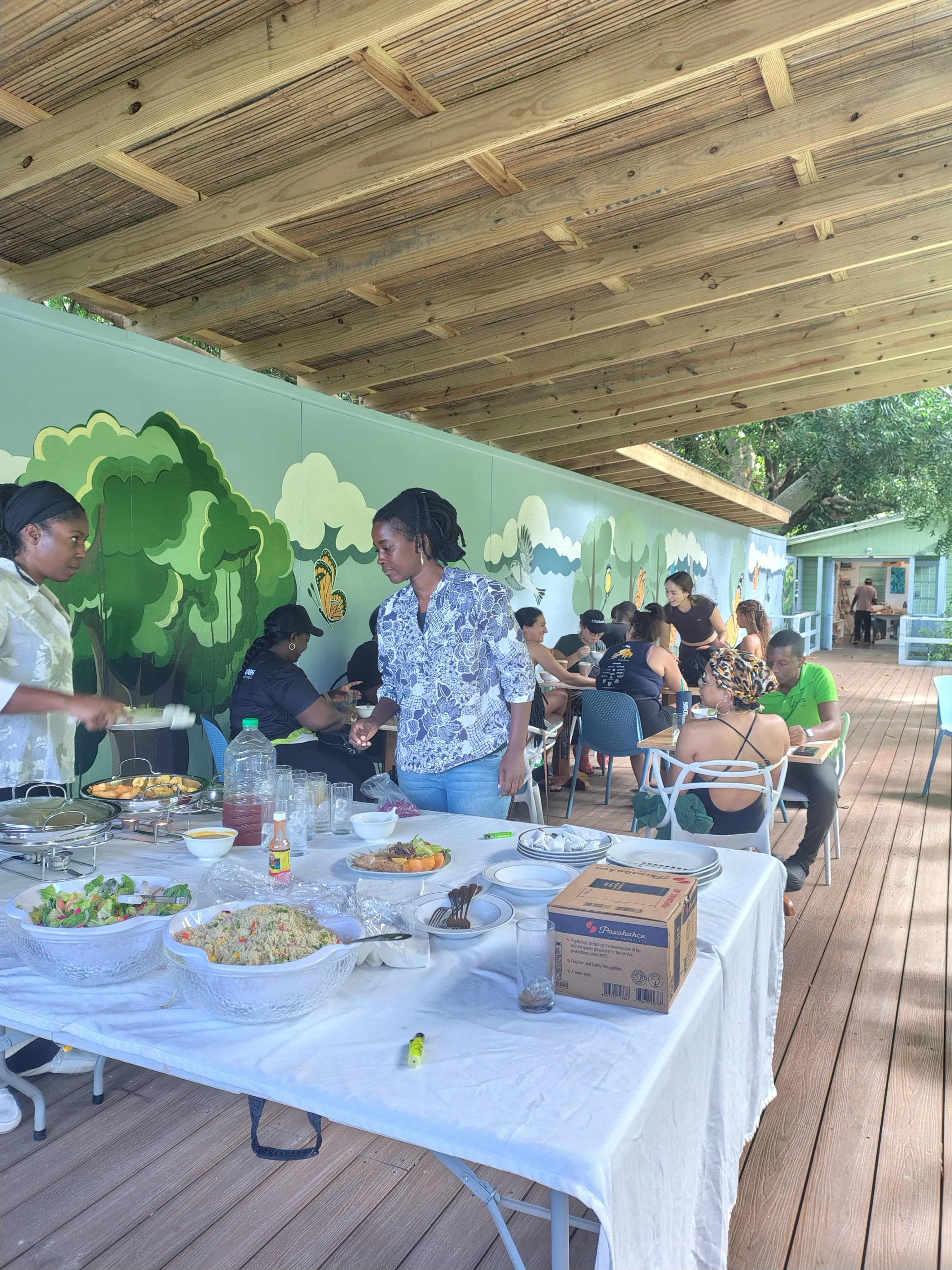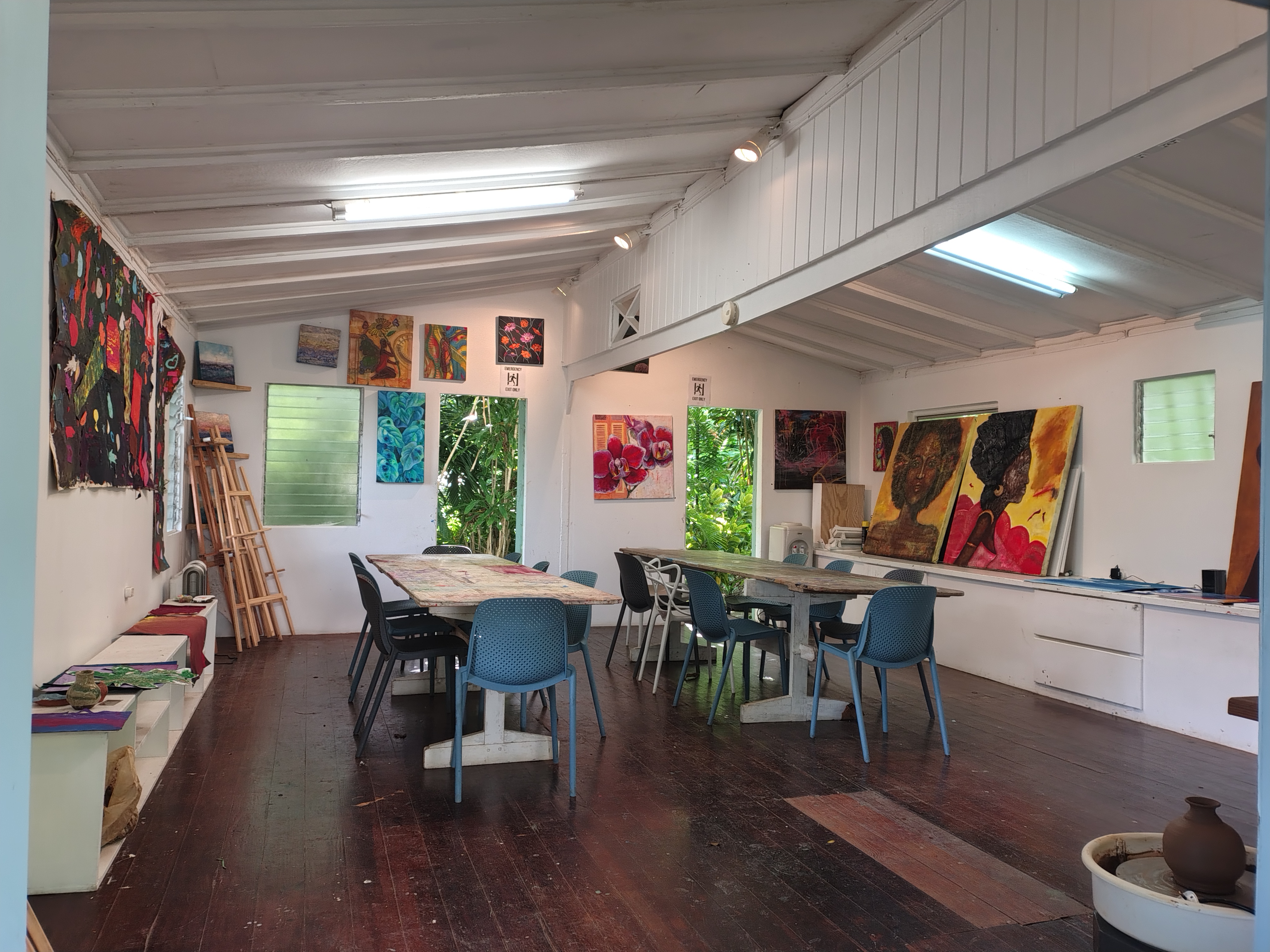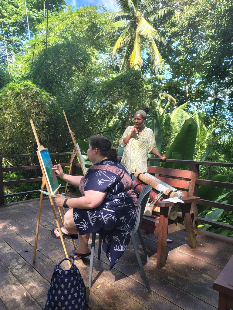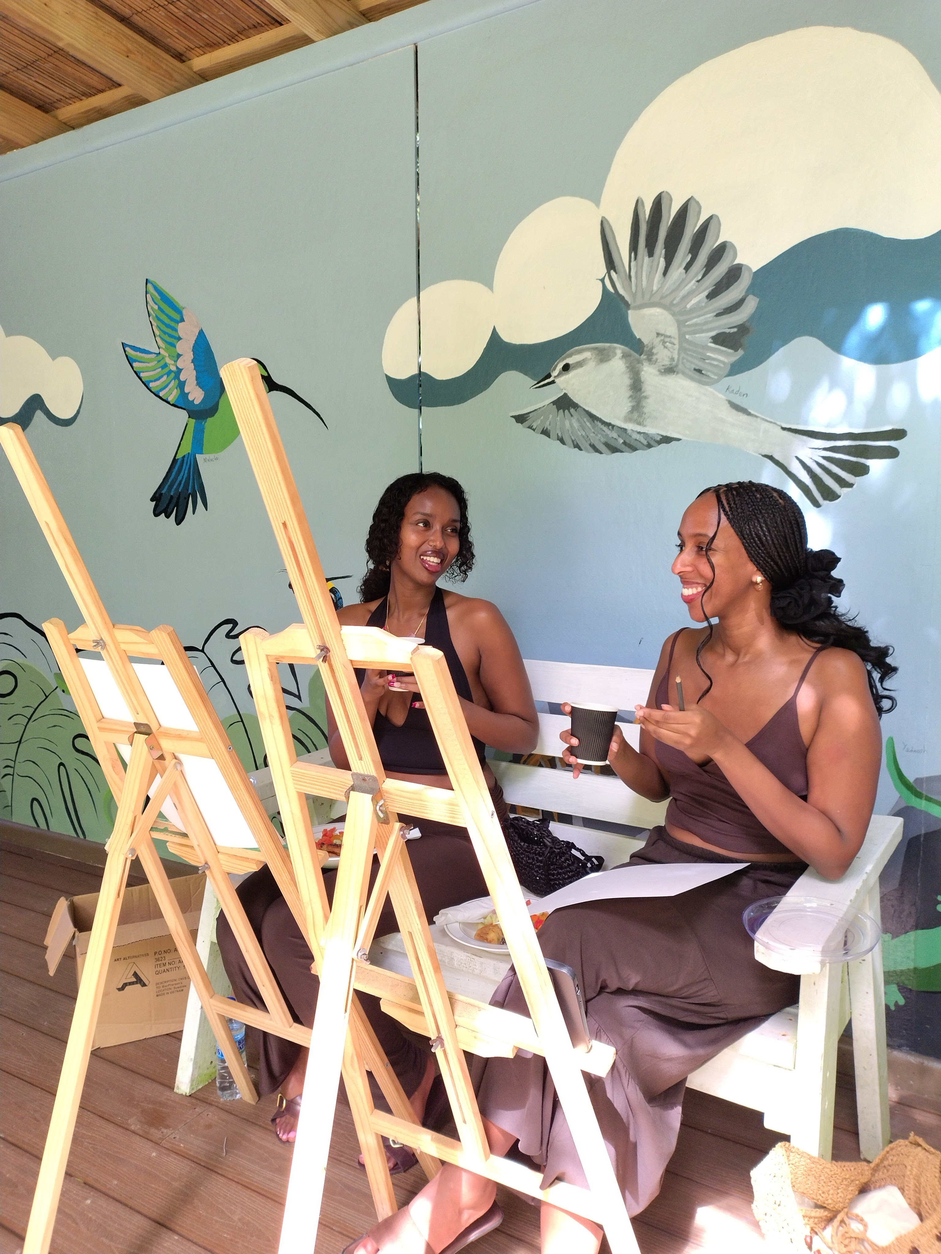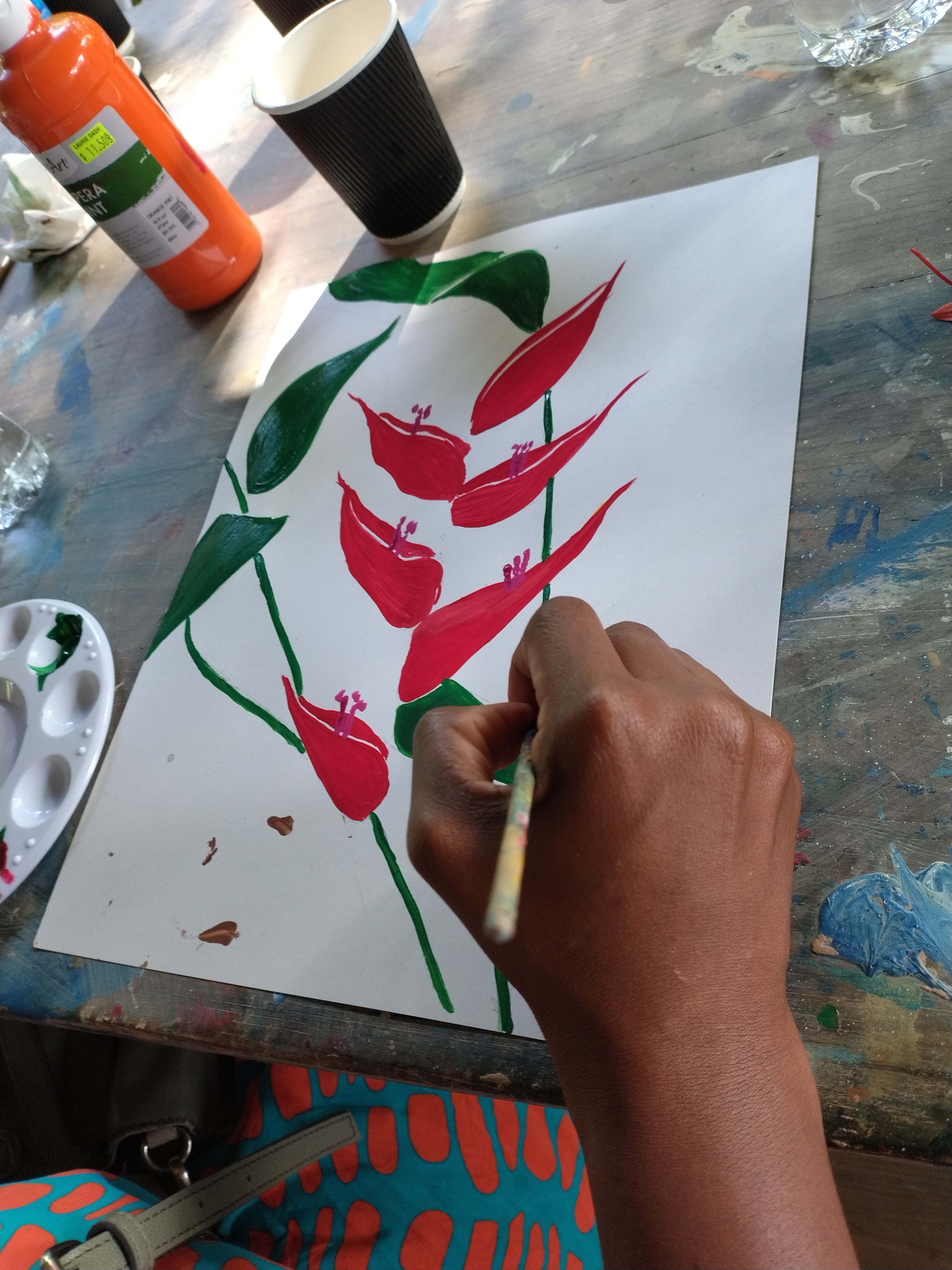 Guests gather in the garden (or inside our Andromeda Community Arts Project building) with their canvas, and paint plants, flowers etc. They will express themselves with acrylic paints while sipping on drinks (including wine and/or rum-based cocktails) and nibbling on a variety of locally made snacks such as fishcakes and breadfruit chips.