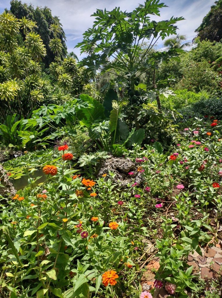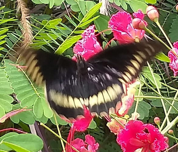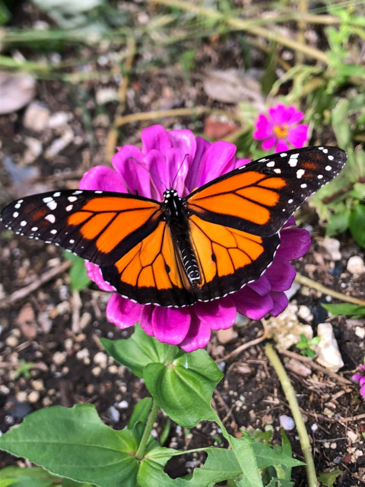We have planted numerous milkweed plants in the Ethnobotanical Garden at Andromeda. In the same area we have sown celosia and zinnia seeds with their nectar-rich flowers. We hope the emerging monarch butterflies (click here for a short video of monarch butterflies in the Bougainvillea Garden), as well as the buck-eye, gulf fritillary and the rare gold-rimmed swallowtail butterflies remain in this area so visitors can enjoy all these wonderful butterfly species, and others, found at this wonderful organic garden.
