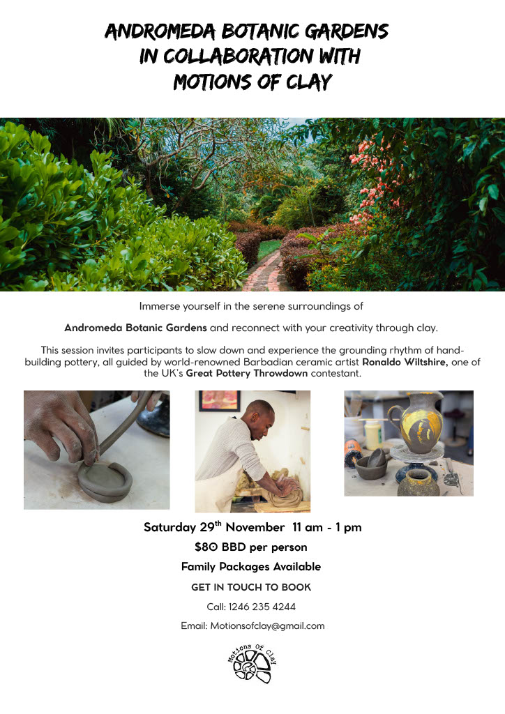 After over a decade of creating and teaching in London, Ronaldo has returned home to share his passion for clay, mindfulness, and artistic expression. In this calming workshop, participants will work with local Barbadian clay.