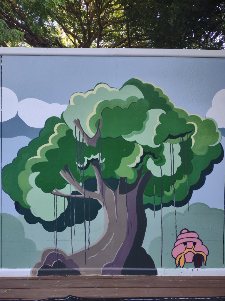 Our volunteers are amazing. Denzil started with painting the blue/grey background. Sandra is a gem. This is one of the trees she painted – a bearded fig!